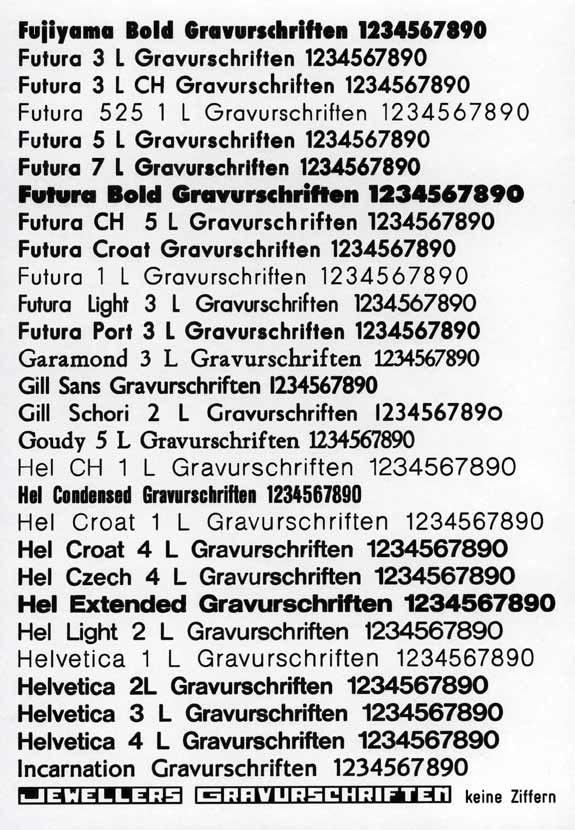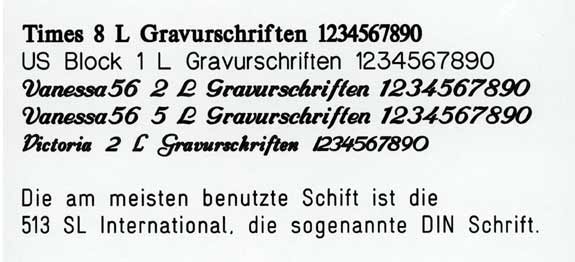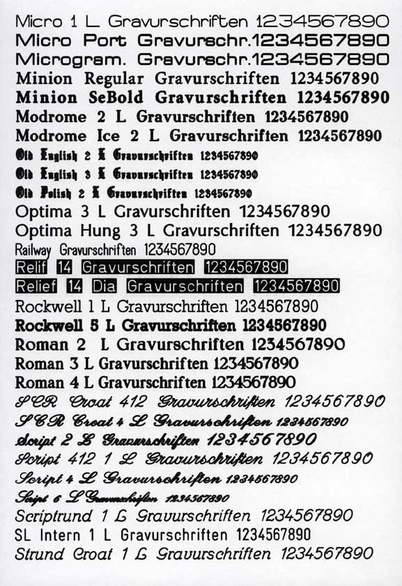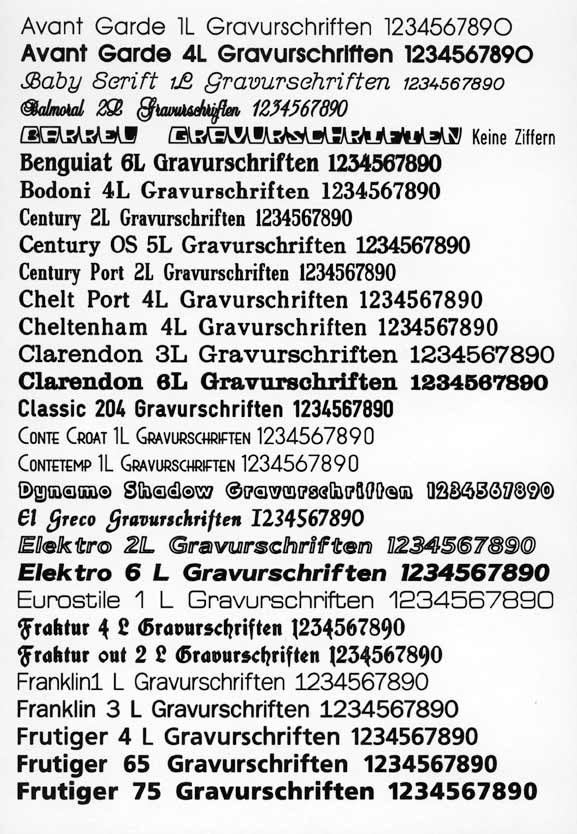 Wir zeigen hier eine Auswahl Gravurschriften, welche für die Gravur optimiert sind. Optimiert, bedeutet schnellere Fertigungszeit gegenüber normalen Word-Schriften. Als Standardschriften ohne Aufpreis sind alle Schriften mit der Endung 1L auswählbar. Die Schriften mit den Endungen 3L bis 8 L sind etwas aufwendiger, da die Ziffern 3 bis 8 Frässpuren (3L usw) erforden ( geringe Mehrpreise sind möglich) Natürlich können wir auch Windows Word Schriften gravieren. Diese entsprechen dem Aufwand nach den 3L – 8 L Schriften, je nach Typ.